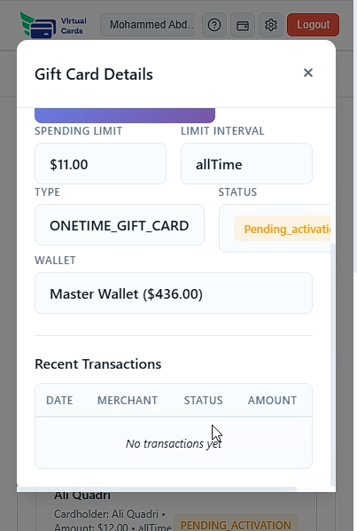💡 TRACKING: Gift cards may show "PENDING_ACTIVATION" status until the recipient activates and uses the card.