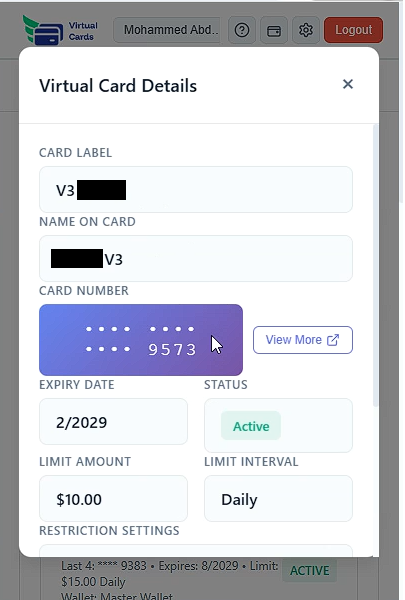 Q: Can I see my card's CVV and full number? A: For security reasons, the extension displays only the last 4 digits of your card number. To view the complete card number and CVV, click the "View More" button in the card details, which will securely redirect you to the Zil Money™ web application where you can access all sensitive card information.