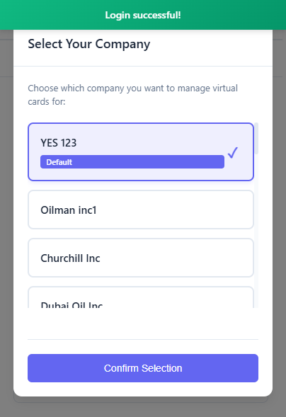After successful login, you may be prompted to select which company you want to manage virtual cards for (if you have multiple companies associated with your account).