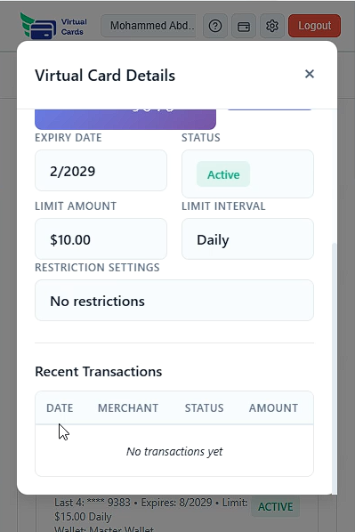 With just a few clicks, you can create virtual cards with custom spending limits, manage multiple wallets, and track all your transactions - without ever leaving your browser tab.
