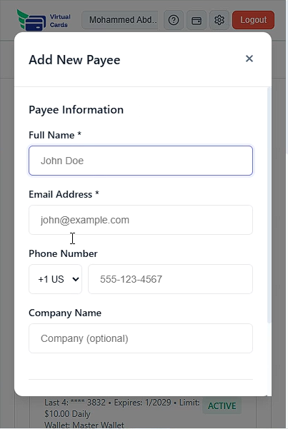 🎴 VIRTUAL CARD TAB View and manage virtual cards for your personal use in online purchases and subscriptions.