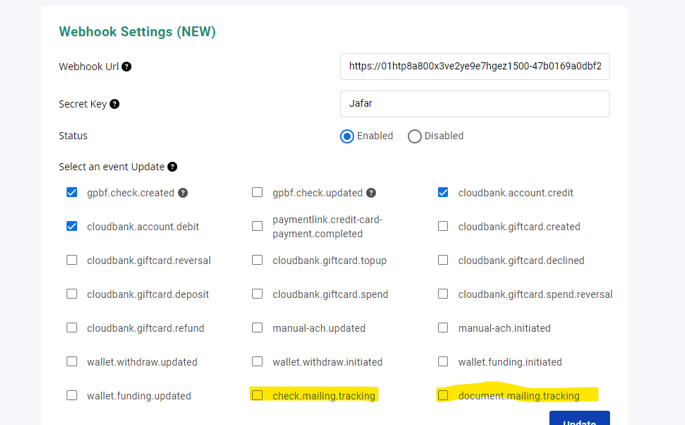 { "event": { "type": "check.mailing.tracking", "data": { "id": "RmA345KVr0egdoL", "mode": "local", "carrier": "USPS", "mailType": 1, "trackingUrl": "", "trackingCode": "123456789012345678901234567890", "trackingStatus": "delivered", "estimatedDeliveryDate": "May 19, 2024 09:19:54 AM", "trackingStatusDesc": "Phase 4c - Delivery", "updatedDate": "May 19, 2024 09:19:54 AM" }, "id": "fd367dee-8dc1-4fbc-a808-e7f935327b2e", "createdAt": "2024-06-15T07:27:05.000000Z" } }